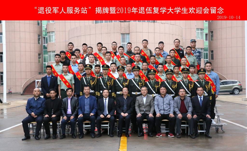 10月14日下午,我院“退役军人服务站”揭牌暨2019年退伍复学大学生欢迎会在水韵楼报告厅举行。党委副书记任得元、杨凌示范区退役军人事务局局长申忠海为“退役军人服务站”揭牌。学院人武部、学生处、教务处、财务处、招就处负责人,分院党总支书记、学工办主任、辅导员代表及2019年78名退伍复学大学生参加活动。