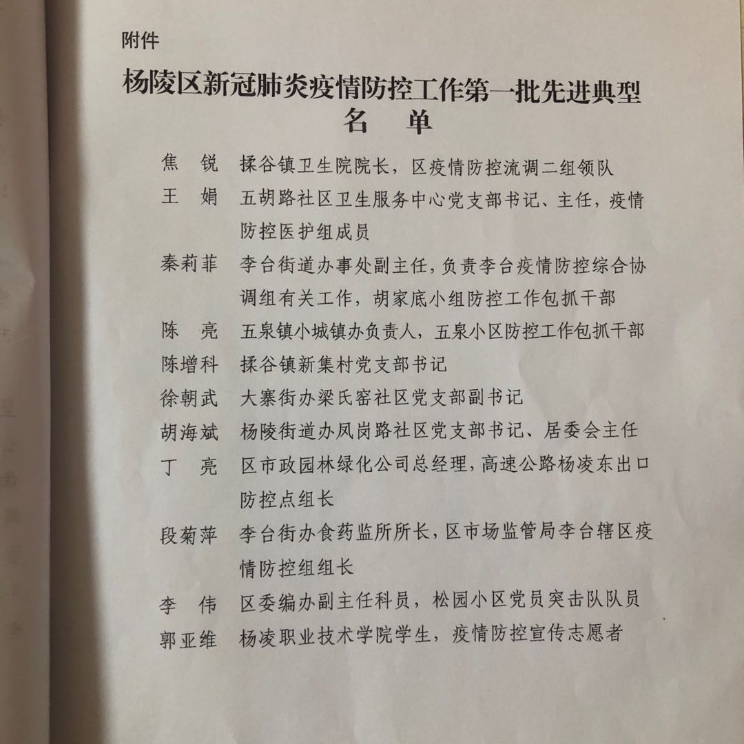新冠肺炎疫情发生以来,我院一批学子主动请缨赴防疫一线,充分展现了当代大学生的优良品质和杨职学子的精神风貌。近日,我院旅游与管理分院学生郭亚维同学在杨陵区疫情防控志愿工作中表现突出,荣获杨陵区新冠肺炎疫情防控先进工作者。