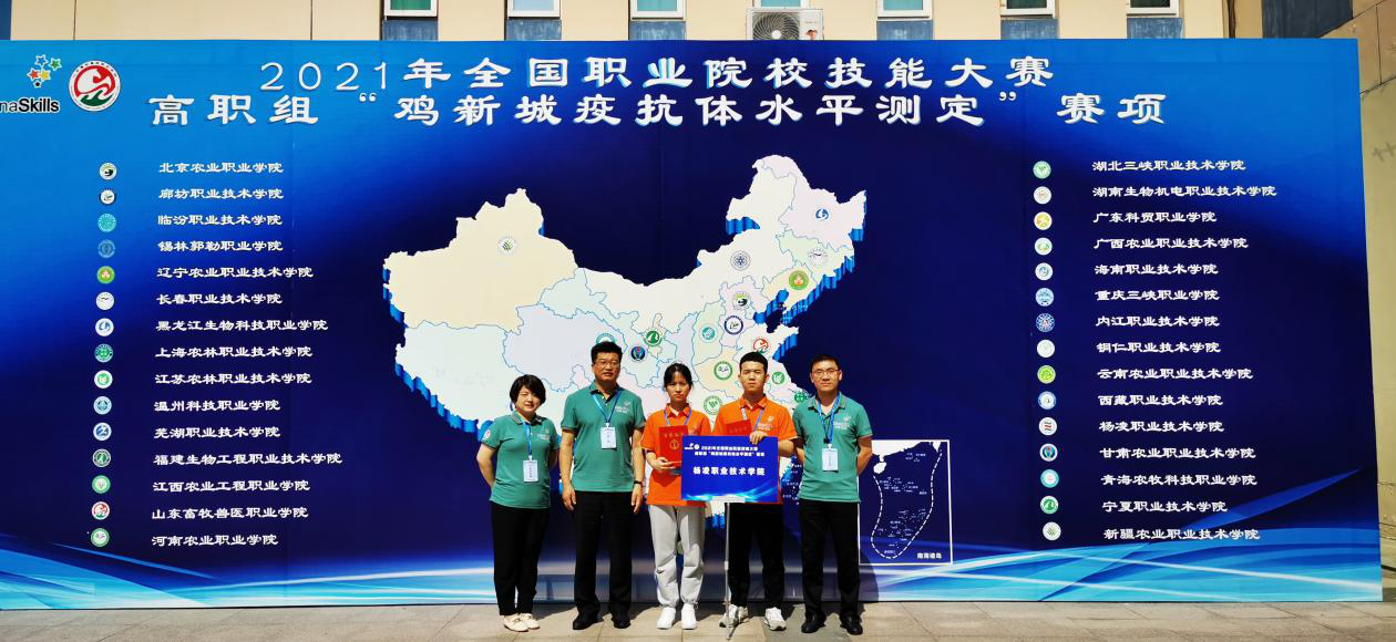 6月17日至20日,2021年全国职业院校技能大赛(高职组)“鸡新城疫抗体水平测定”赛项在山东畜牧兽医职业学院举行。我校张宇红、马双平同学代表陕西省参加了比赛,经过激烈角逐,荣获团体二等奖。