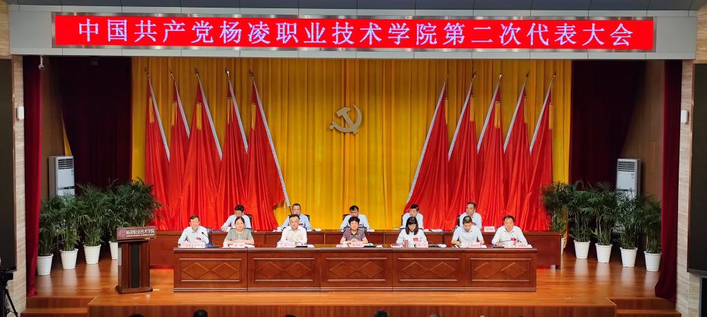 6月30日,中国共产党杨凌职业技术学院第二次代表大会在南校区醒钟楼思辩堂隆重召开。会场里悬挂着“凝心聚力 勇攀高峰 为建设中国特色世界一流职业大学而努力奋斗”的标语,主席台上金色的党徽和鲜艳的红旗分外夺目。