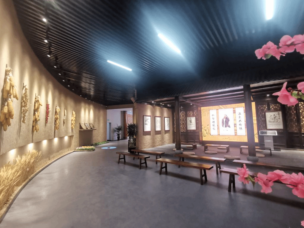 力耕勤读展厅作为展馆中的重点部分,以古木深色营造出了厚重的历史文化氛围,从言传身教、学字知事、边耕边读、乡绅表率、职业教育五个部分,系统展示了耕读文化的历史发展和文化传承。