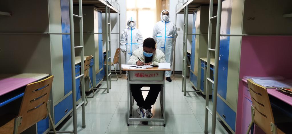 “规定要求监考老师和考生不能接触,所以我们在他的宿舍内放置了摄像机,我们在他对面的宿舍全程观看,以这样的形式进行监考。”西北农林科技大学工作人员介绍说,除了他以外,参与这场特殊考试的还有两名监考老师,两名押送试卷的老师,一名负责拍摄的工作人员以及一名医护人员。“消杀工作也很严密,比如试卷提交后,正反面我们都会用紫外线消杀半小时,确保安全无误。”