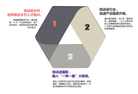 “党建引领‘三进五化’育训赋能乡村振兴”育训模式即:以“党建+”为引领,通过“校政融通、校企联通、校校贯通”三通机制促进继续教育三全育人,以“培训+”为抓手,持续推进培训“进乡村、进行业、进国际”,落实培训“与产城产教结合、与行业企业结合、与乡村振兴结合”,通过“三进三结合”,推动培训“精准化、全息化、国际化、公益化、持证化”的五化培训体系,助推“产业振兴、人才振兴、文化振兴、生态振兴、组织振兴”五大振兴同步发展。