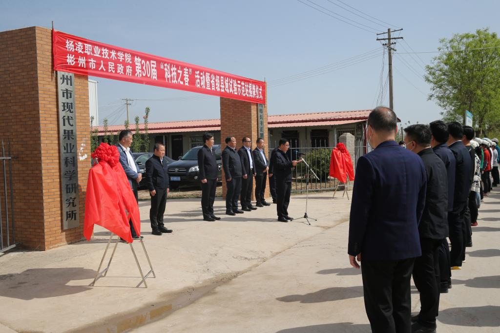 仪式上,郑永岗宣读了省科学技术厅关于省级县域科技创新试验示范站的批复文件,郭杰和任挺共同为陕西省农业科技创新试验示范站揭牌,张涛代表省教育厅讲话,并对本届活动提出要求,王周锁和石万虎共同为杨凌职业技术学院彬州市现代果业产学研基地揭牌,任挺致欢迎辞。
