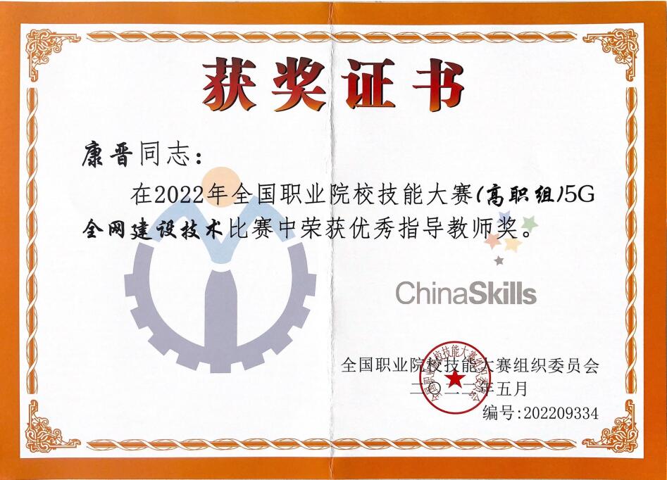 8月22日至23日,2022年全国职业院校技能大赛高职组“5G全网建设技术”赛项在济南职业学院举办,来自全国28个省、56支代表队、112名选手参加了比赛。经过8个小时的激烈比拼,我校信息工程学院学生郑嘉昊、曹文森以总分排名全国第一的成绩,荣获一等奖第一名,取得我校自参赛以来历史最好成绩指导教师康晋、陈高锋荣获大赛优秀指导教师奖