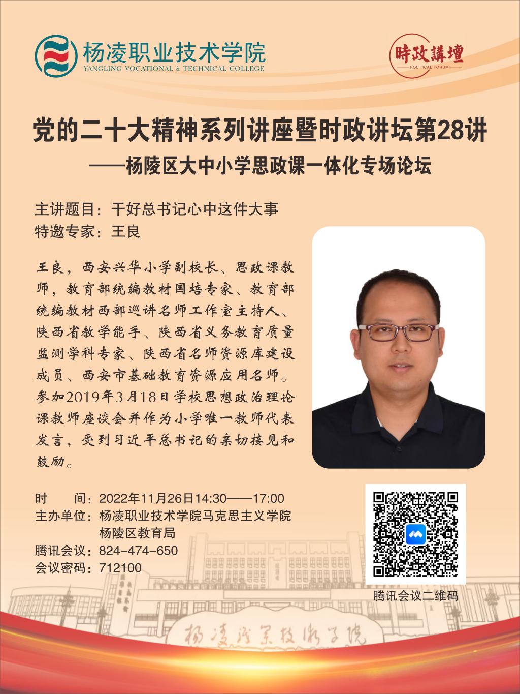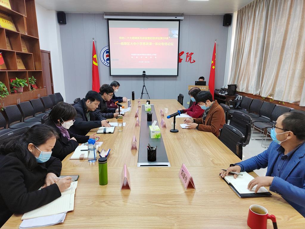 为深入学习贯彻党的二十大精神,推动杨陵区大中小学思政课一体化建设,11月26日下午,我校举办党的二十大精神系列讲座暨时政讲坛第28讲——杨陵区大中小学思政课一体化专场论坛,全国学校思想政治理论课教师座谈会发言教师代表、西安兴华小学副校长王良在线上作题为“干好习近平总书记心中的这件大事”的主题报告。论坛由马克思主义学院与杨陵区教育局联合主办。