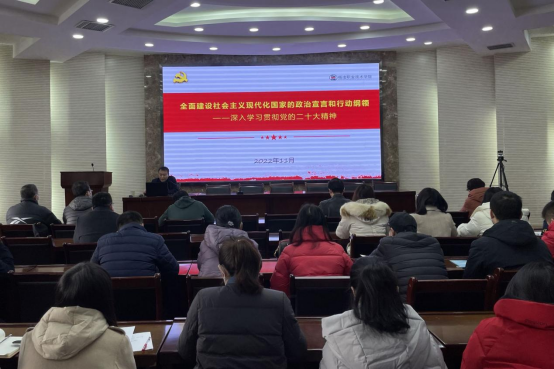 12月5日下午,党委副书记、纪委书记王勇胜以“全面建设社会主义现代化国家的政治宣言和行动纲领”为题,为建筑工程学院教职工宣讲党的二十大精神。