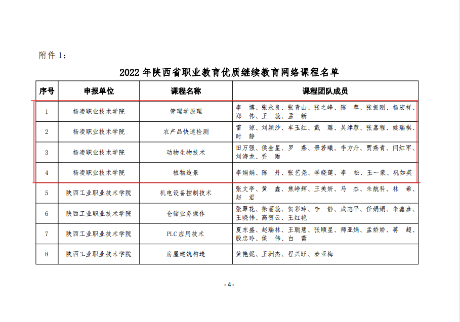 本次优质继续教育网络课程认定工作经过专家审阅课程申报资料、登录平台查看课程资源、综合打分排序和网上公示等环节,全省共有50门课程被认定为2022年陕西省职业教育优质继续教育网络课程,我校管理学原理、农产品快速检测、动物生物技术和植物造景4门课程入选。下一步,学校将按照文件的建设要求,高质量完成课程后续建设任务。