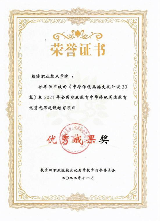 4月23日,教育部职业院校文化素质教育指导委员会颁发了全国职业教育中华传统美德教育优秀成果建设培育项目典型案例奖、优秀案例奖和优秀成果奖证书。其中,《以“正禾育人工程打造师生崇德向善“精神家园”》、《“24节气暨农耕文化”教育工程》荣获典型案例奖,《“中华优秀美德文化”教育工程》荣获优秀案例奖,《中华传统美德文化卧谈30篇》荣获优秀成果奖。