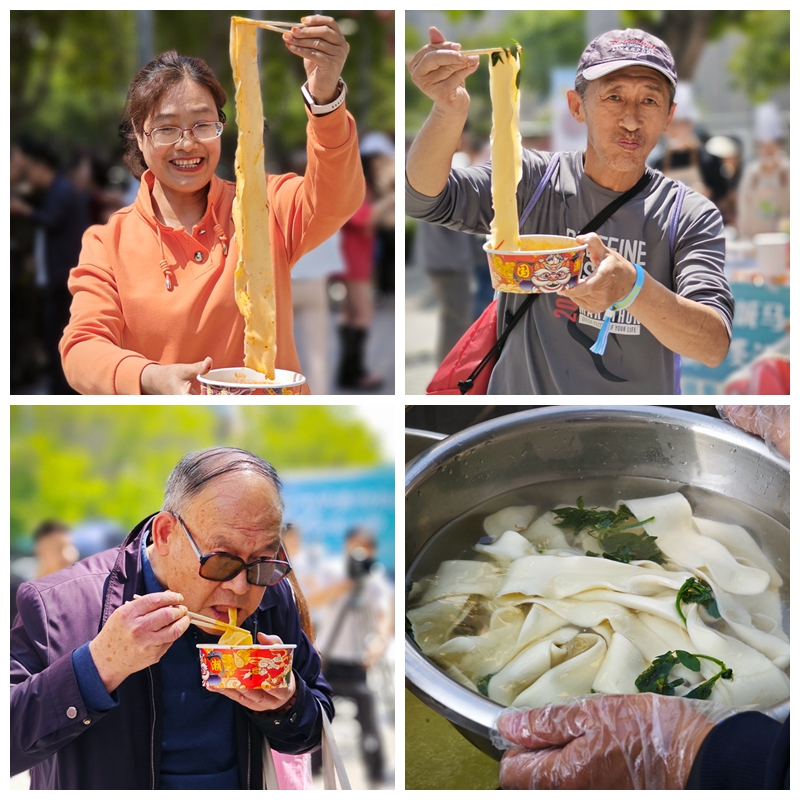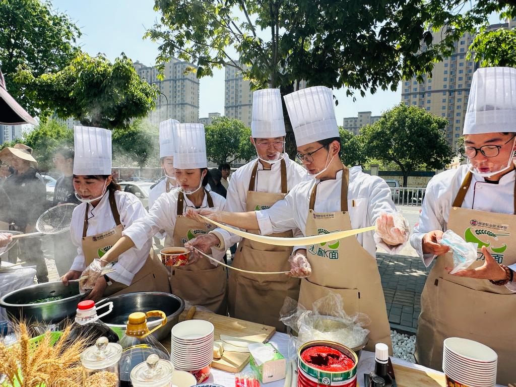 品鉴活动设置“科技创新体验组”、“国际合作体验组”、“乡村振兴体验组”、“示范推广体验组”等四个组别,参赛选手中有高校师生、有社区居民、有蘸水面商家,杨职代表队参加的是“示范推广体验组”。活动中,我校师生把一块块面团,通过揉、擀、扯、甩的手法,加工成又宽又长、又薄又劲道的面条,大家配合默契、技术到位、分工明确,完美展现了我校学生的风采。