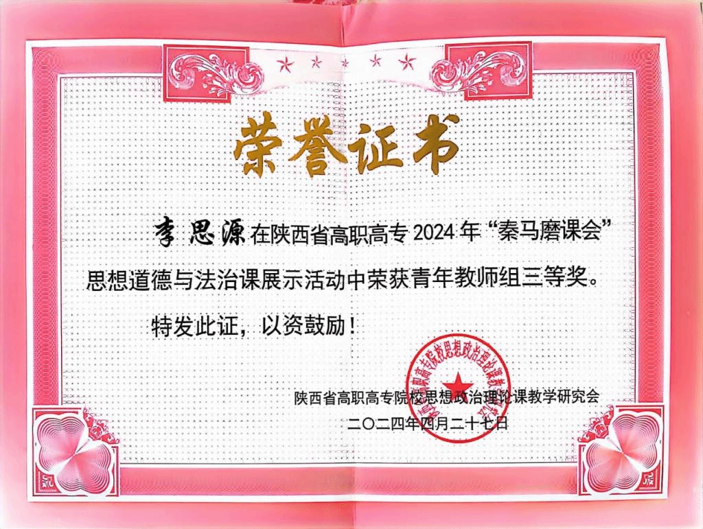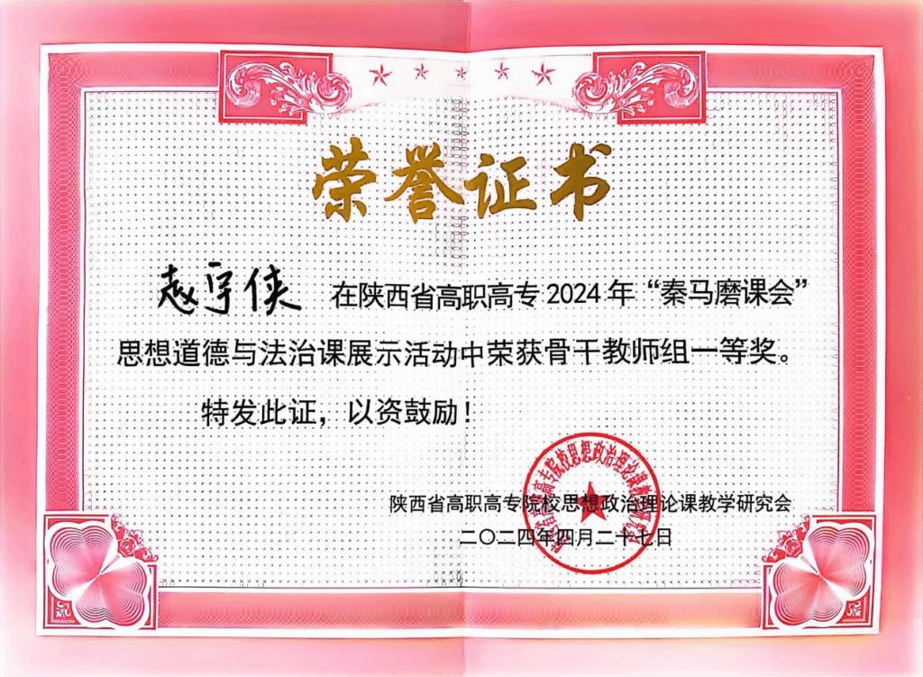 4月27日,我校马克思主义学院教师参加了陕西省高职高专2024年“秦马磨课会”思想道德与法治课程现场展示活动,赵宇侠荣获骨干教师组一等奖,李思源获青年教师组三等奖。