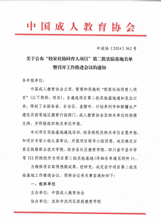 近日,中国成人教育协会公布了全国“校家社协同育人项目”第二批实验基地,我校成功入选。