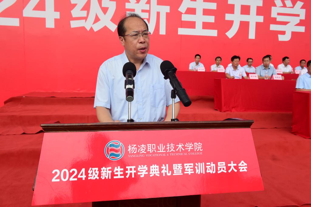 仲伟周在讲话中首先代表全校师生对来自全国各地的2024级新生表示热烈欢迎,并简要介绍了学校办学历史和基本情况。他寄语同学们,要崇德向善,做“心中有德”的新时代青年;要坚定理想,做“眼中有光”的新时代青年;要精技强能,做“肩上有责”的新时代青年;要踏实笃行,做“脚下有路”的新时代青年。他通过分享赵瑜老师“心中有德、眼中有光、肩上有责、脚下有路”的感人事迹,鼓励同学们以赵瑜老师为代表的杨职教师为榜样,心怀至善,志存高远,踏实奋进、精技强能,努力成长为可堪大用的德智体美劳全面发展的社会主义建设者和接班人。他希望,同学们要在军训中深化认识、增强观念,不断提升国防意识和爱国热情;耐得辛苦、忍得枯燥,面对各种困难,时刻保持饱满的热情和高昂的斗志;严守纪律、争当标兵,养成良好的习惯,争创佳绩,与教官共同努力,圆满完成军训任务,上好进入大学的第一课。