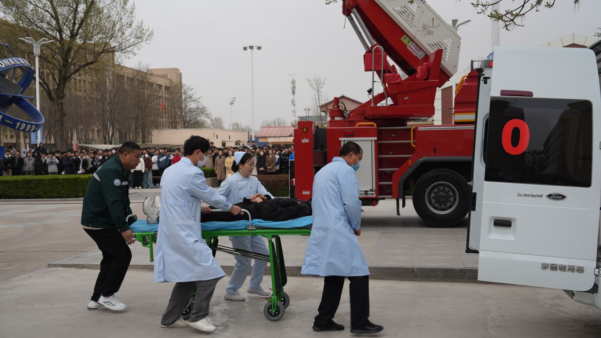 演练以104学子楼一房间突发火灾为背景,当即启动校园火灾事故处置工作应急预案,示范区消防救援支队出动6台消防车,示范区医院出动2台救护车,现场演练了应急疏散、火灾初起处置、医疗救护、灭火救援,讲解了消防知识。