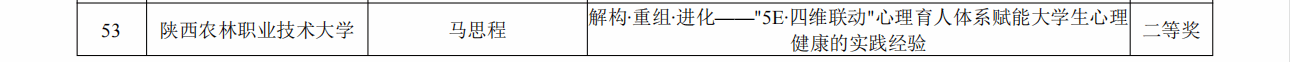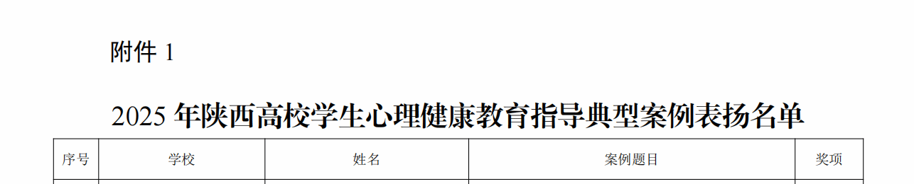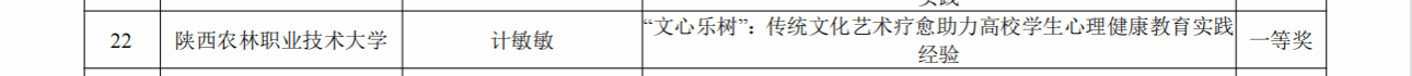 在2025年陕西高校学生心理健康教育指导典型经验评选中,《“文心乐树”:传统文化艺术疗愈助力高校学生心理健康教育实践经验》获一等奖,《解构·重组·进化——“5E·四维联动”心理育人体系赋能大学生心理健康的实践经验》获二等奖。在2025年陕西高校学生心理健康教育指导典型案例评选中,《向阳而生,匠心筑梦——积极心理学视域下“三全五阶”心理育人模式创新与实践》获三等奖。在第六届陕西高校校园心理情景剧活动中,参赛作品《逆风》获三等奖;学生在第七届陕西高校大学生心理健康科普知识竞赛活动中获优秀奖。