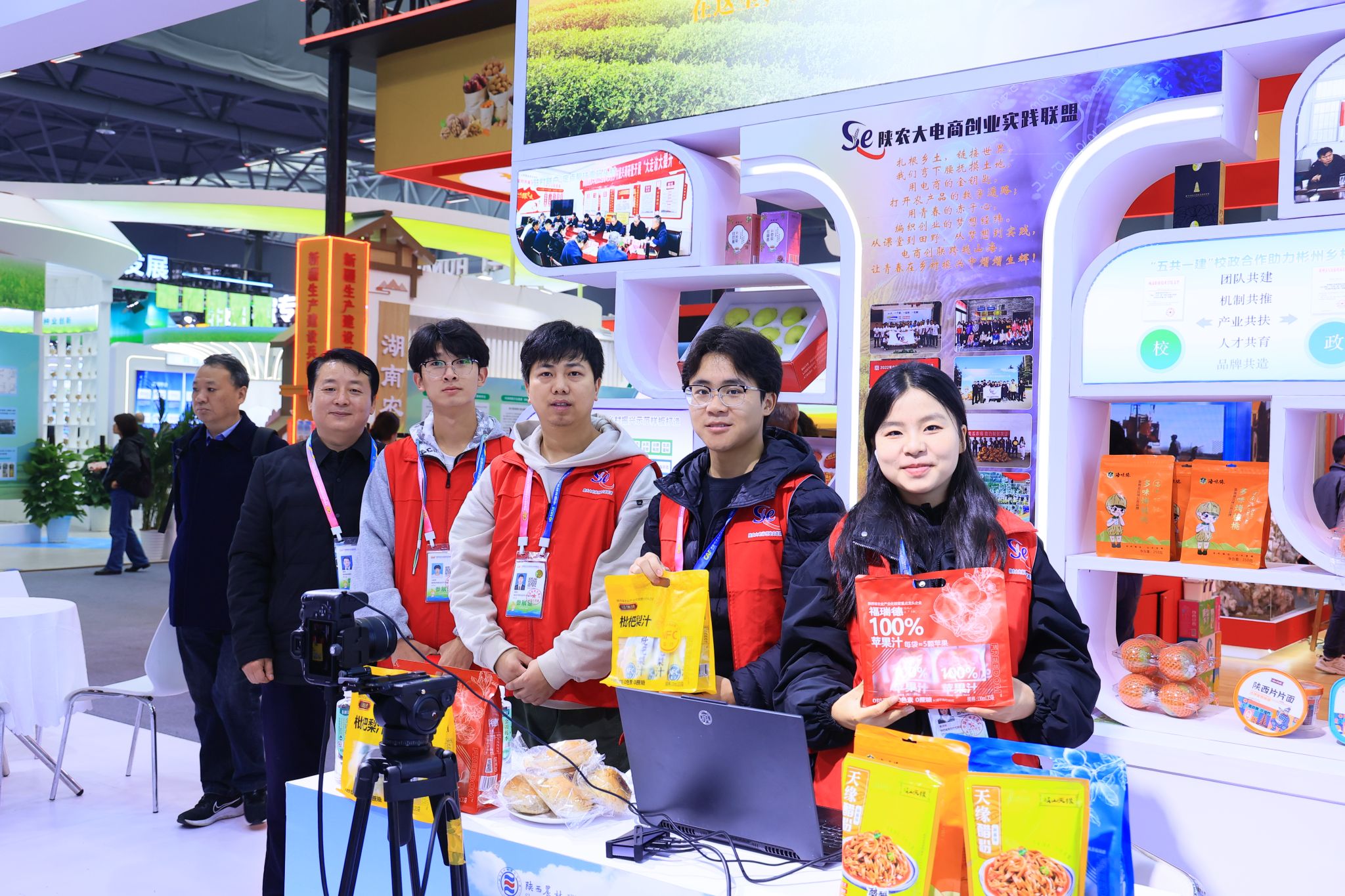 展位内,学校的国审“武农981”“武农988”“职院171”等小麦新品种、林麝产业研发中心的林麝活体标本、火龙果产业研发中心的“秦红龙”火龙果、秦岭食用菌产业研发中心的羊肚菌、蜂产业研究院的蜂蜜系列产品、马文哲教授在彬州基地指导培育的苹果新品种、蝴蝶兰产学研基地的多彩蝴蝶兰鲜花、“丝路驼铃”“花好月圆”根雕作品等科技成果展品有序陈列、琳琅满目,成为众多参展群众打卡“明星单品”。学校10余名专家全程驻场众提供“零距离”专业咨询服务并发放实用技术资料电商创业实践联盟团队同步开展直播,助力更多观众了解学校成果展品。