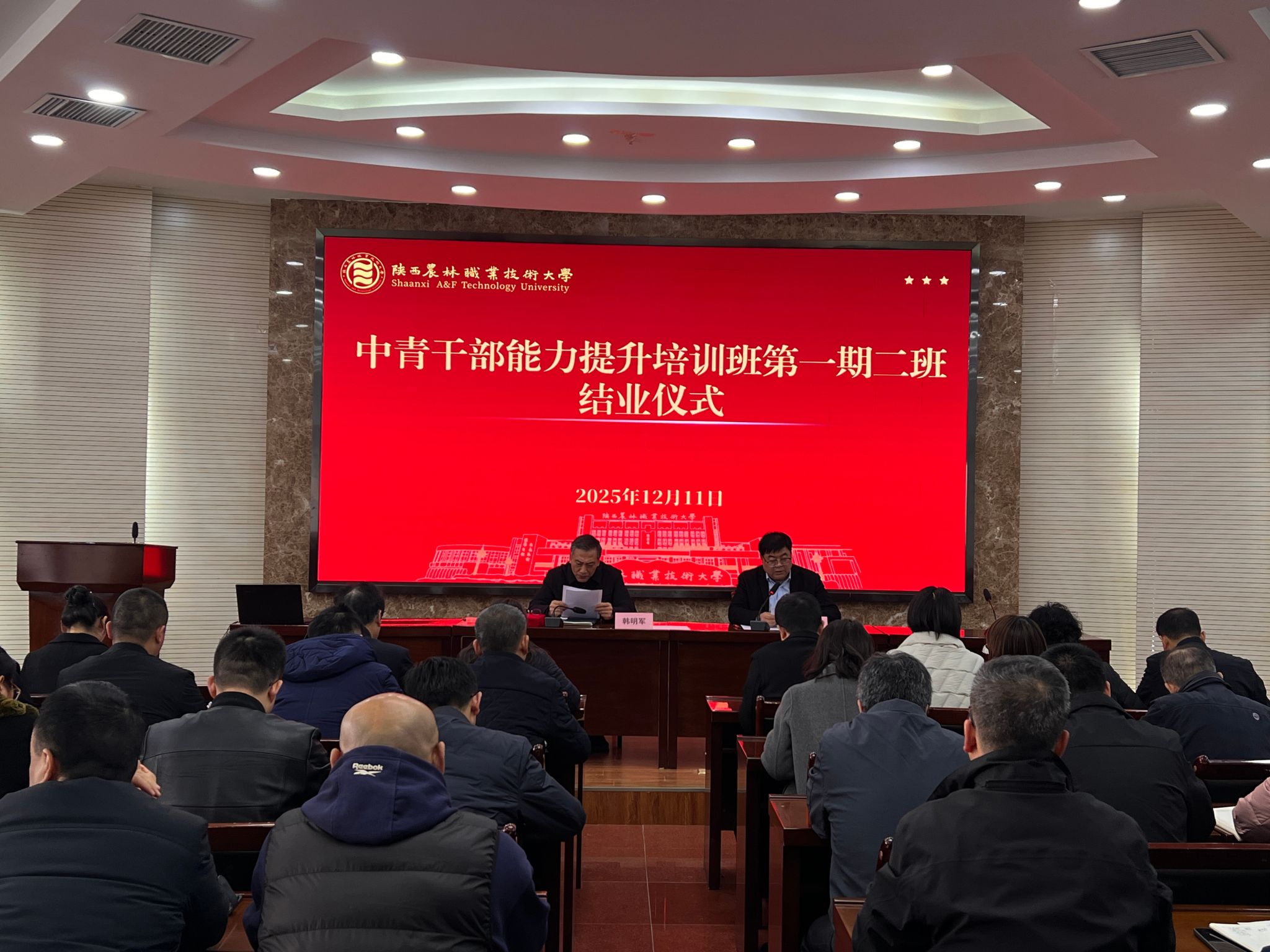 12月11日,学校举行中青干部能力提升班一期二班结业式。党委书记韩明军出席结业式并讲话,党委副书记刘瑞明主持结业式,培训班40名学员参加。