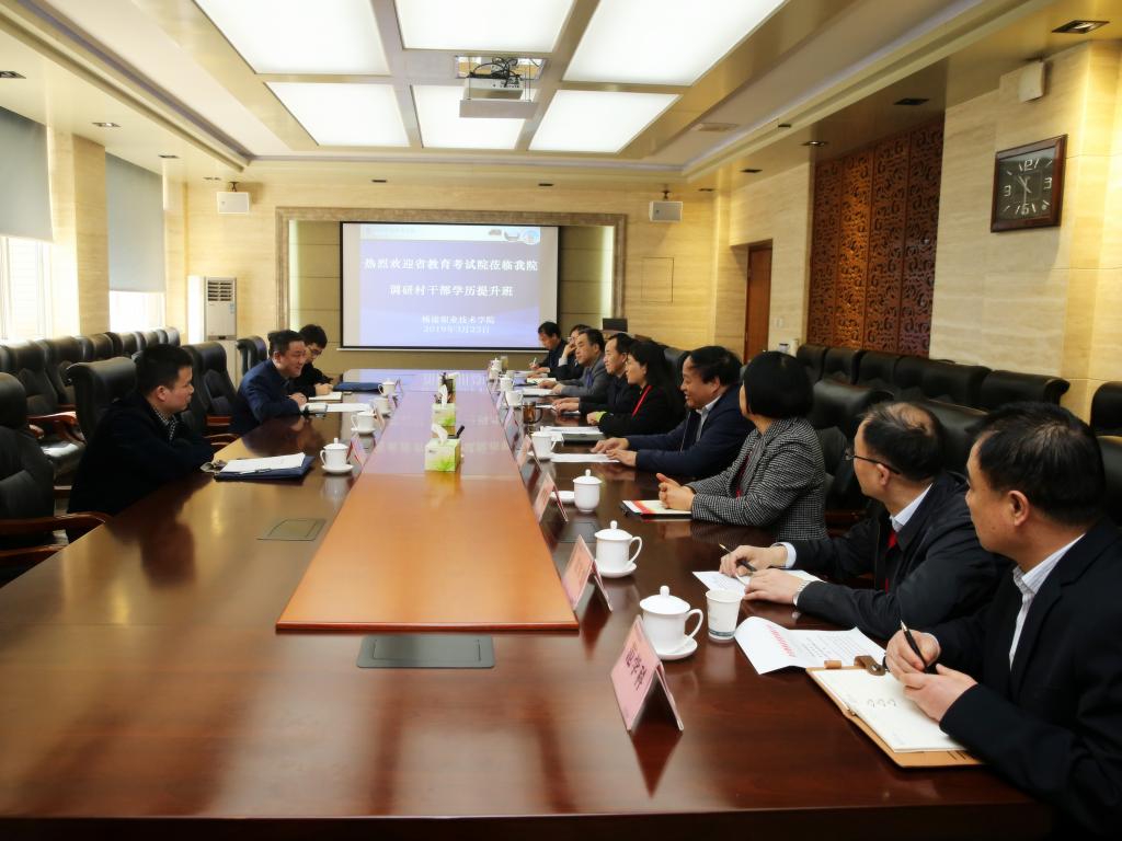 省教育考试院普招处副处长封辉一行三人来到我院,对村干部学历提升班进行调研,详细了解了我院村干部学历提升班的教育思路,讨论了高职院校百万扩招计划的思考和建议,并实地调研了我院机测考场和考务工作。学院领导陈宁、王周锁、张永良、刘粉莲、张宏辉,以及招生就业处、生物工程分院主要负责人等陪同调研。