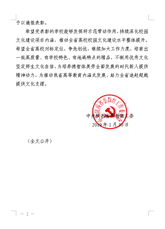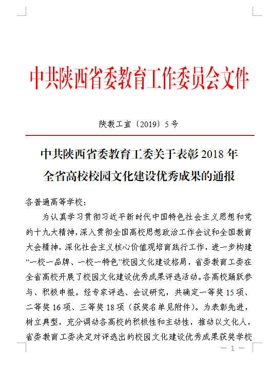 近日,中共陕西省委教育工委公布了2018年全省高校校园文化建设优秀成果获奖名单,由我院申报的《中华经典晨读:创新校园文化育人路径培育学生文化自信的实践探索》获一等奖。
