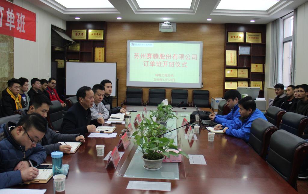 12月20日上午,我院机电工程分院举行了苏州赛腾精密电子股份有限公司(简称“苏州赛腾”)订单班开班仪式。苏州赛腾技术研究院主任张会领、课长杨军林,机电分院相关负责人、相关专业教研室教师,以及首批订单班的30名学生参加了仪式。