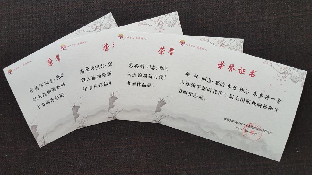 近日,“翰墨新时代”——第二届全国职业院校师生书画作品展落下帷幕。我院教师李德君、高掌平和学生高安刚、张旺的书法作品入选了第二届全国职业院校师生书画作品展。