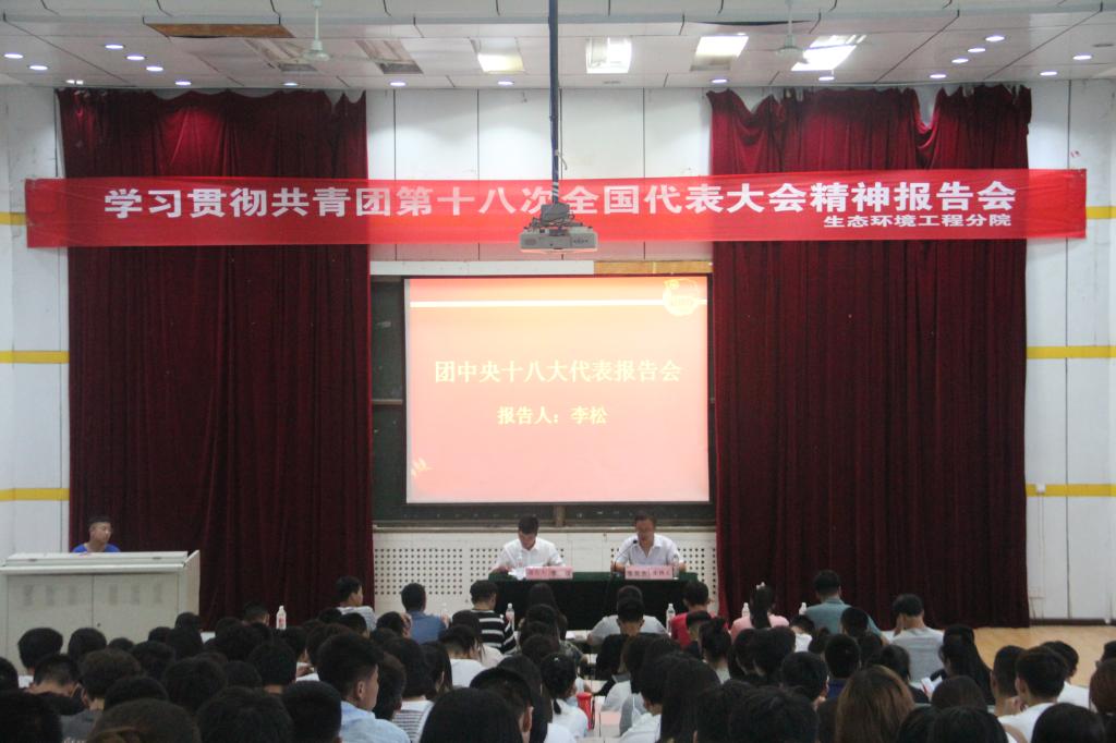 7月1日晚,由生态环境工程分院组织的“学习贯彻共青团第十八次全国代表大会精神报告会”在西校区台阶教室举行。共青团第十八次全国代表大会代表、我院优秀校友李松参加共青团第十八次全国代表大会后回到母校,第一时间为生态环境工程分院宣讲共青团十八大精神。生态分院师生代表300余人参加了此次报告会。