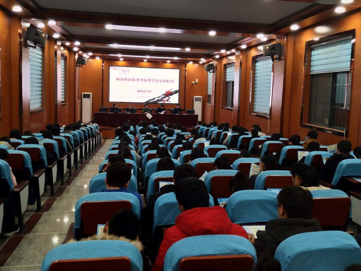 3月6日晚,我院在商洛市商州区中学举行了杨凌职业技术学院奖学金发放仪式,为商州中学40名学生颁发奖学金。学院纪委书记刘粉莲,招生就业处、水利工程分院负责人,商州区中学高三年级组师生代表200余人参加了发放仪式。