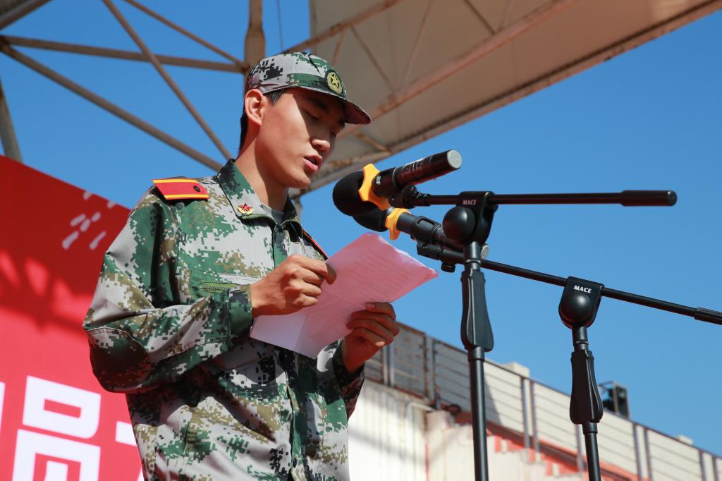 开学典礼暨军训动员大会上,经济与贸易分院教师郑伟、生态环境工程分院2017级新生石健阳分别作了发言,中国人民解放军68302部队、本次军训团团长马防作了动员讲话。