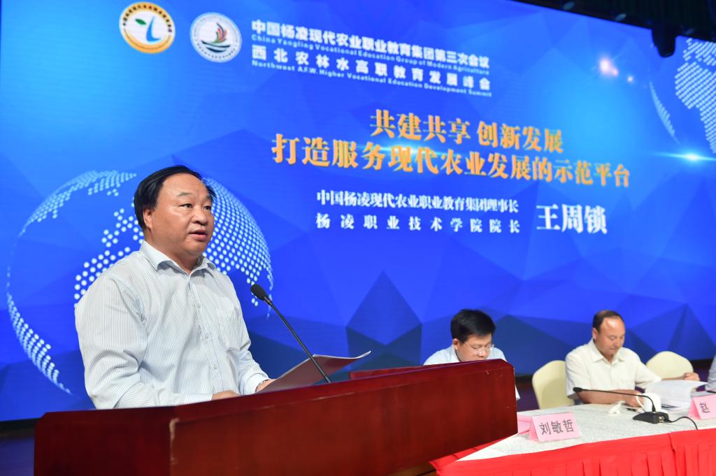 随后,中国杨凌现代农业职业教育集团理事长、杨凌职业技术学院院长王周锁作集团工作报告。杨凌现代农业职业教育集团成立于2010年7月,集团依托杨凌职业技术学院,由省内90余家涉农职业院校和企事业单位组建而成。经过不断的创新发展,集团已有理事成员159个,其中企业107个、高中职院校49个、科研院所3个,而且33个企业在集团内职业院校设立了人才培养基地、开办订单班51个,并设立奖学金12类,办学模式不断创新,服务国家发展战略的能力进一步提升,充分发挥了政府、职业院校、企事业单位和社会团体各方在经济社会发展中的重要作用。集团近七年来取得了十大成绩:一是健全优化了集团运行体制;二是建立完善了集团成员信息库;三是拓展增强了集团成员合作交流功能;四是坚持全面育人,创新实施“四位一体”人才培养方案;五是深化校企深度合作,创新协同育人机制;六是积极探索校校合作,构建现代职业教育体系;七是适应“互联网+”发展,全面推进混合式教学;八是开展国际合作,服务“一带一路”倡议;九是履行社会责任,助推国家精准扶贫战略;十是发挥职业教育优势,支持农业现代化战略。