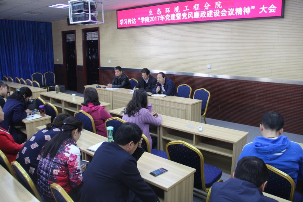 3月27日下午,生态环境工程分院召开党建工作会议,学习传达学院2017年党建暨党风廉政建设会议精神。该分院党总支书记介绍了学院召开2017年党建暨党风廉政建设会议的相关情况,并对如何结合实际落实会议精神促进党建工作提出了具体要求。该分院院长带领大家一起学习了赵曼书记的讲话,并对讲话重点内容进行了深入分析与解读。