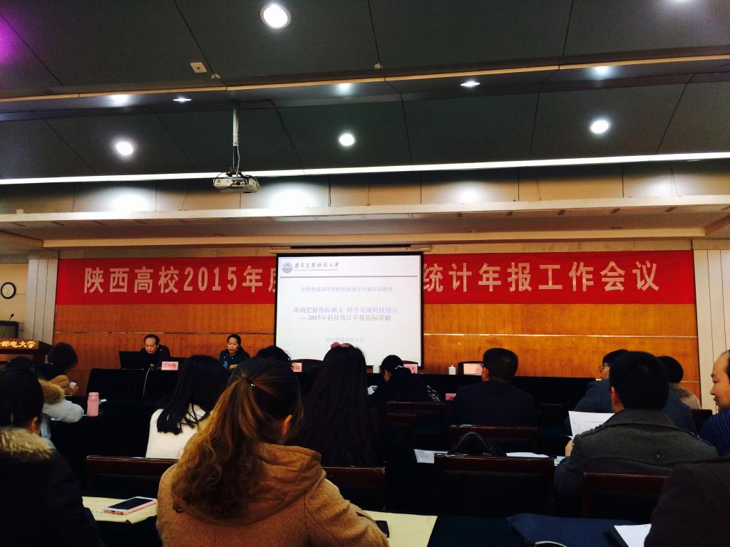 会议部署了 “十二五”科研工作总结及相关数据的报送工作;布置了2015年度陕西省普通高等院校科技社科统计年报工作;对科技社科统计指标体系和计算机应用软件进行培训和答疑。