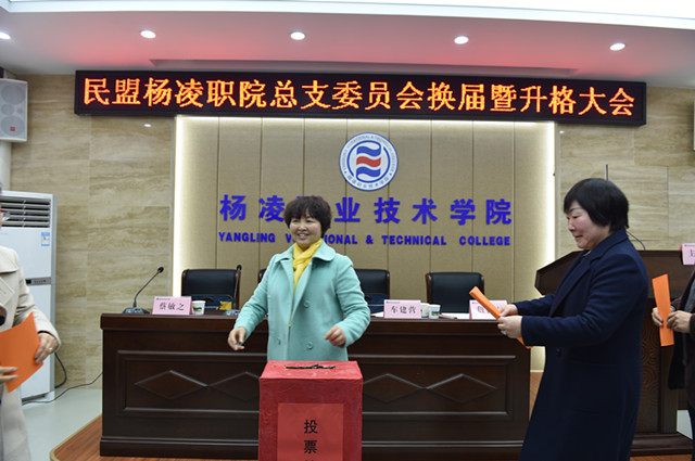 会上,我院民盟总支第二届主委刘玉凤代表民盟总支向大会作了工作报告,民盟陕西省委组织部部长蔡敏芝宣读了《民盟陕西省委关于民盟杨凌职业技术学院换届(升格)工作的批复》。大会按照组织程序选举产生了我院民盟新一届委员会,马安良、马志峰、王耀勇、史建新、吕建灵、刘玉凤、张小林、韩东峰、杨安平等9名同志当选为新一届委员会委员。
