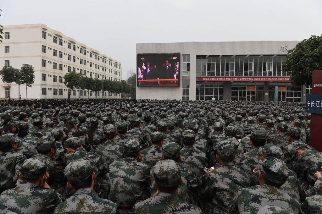 70响轰隆的礼炮拉开纪念仪式的序幕时,师生不约而同地全体起立;当五星红旗迎着微风飘扬在天安门广场时,师生们高唱国歌,自豪之情油然而生。盛大的阅兵式开始,雄壮的乐曲声中,同学们凝神关注,激动的神情和自豪的感觉仿佛已经写在了脸上。在场的师生们深深为“壮我国防、扬我军威”的阅兵场面所震撼。当习近平总书记高呼“正义必胜!和平必胜!人民必胜!”时,所有的收看点现场沸腾了,掌声、欢呼声久久不息。