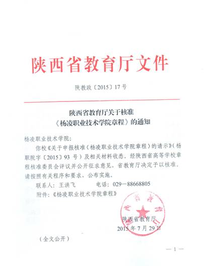 729日,《陕西省教育厅关于核准<杨凌职业技术学院章程>的通知》(陕教政〔20157号)明确,《杨凌职业技术学院章程》经陕西省高等学校章程核准委员会评议并公开征求意见,省教育厅决定予以核准。
