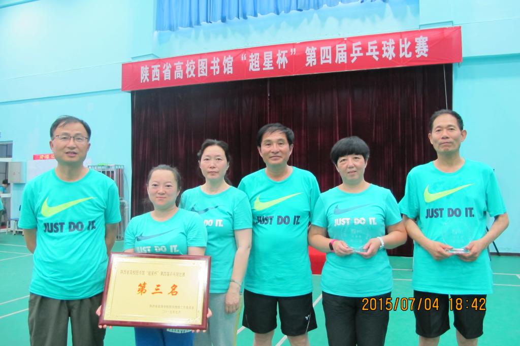 74日,陕西省高校图书馆“超星杯”第四届乒乓球比赛暨馆领导乒乓球友谊赛落下帷幕,我院图书与信息中心荣获团体第三名,成全之同志获男子单打第五名,吴小凤同志获女子单打第八名。