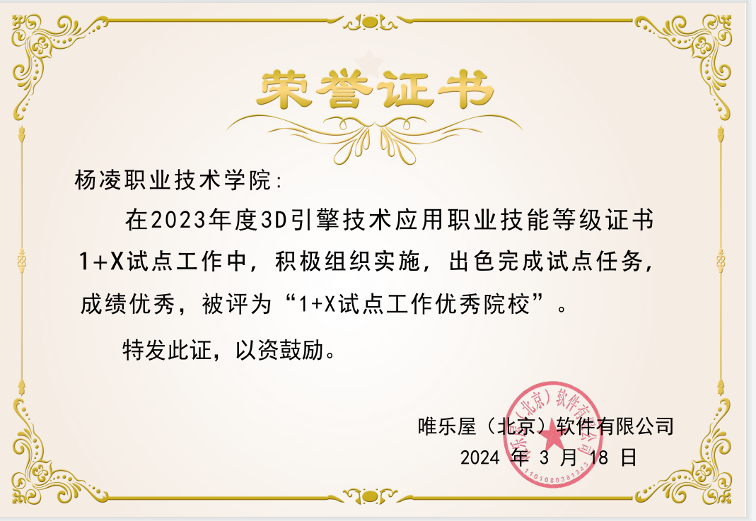 近日,学校在2023年度3D引擎技术应用职业技能等级证书1+X试点工作中,积极组织实施,出色完成试点任务,成绩优秀,被评为“1+X试点工作优秀院校”。