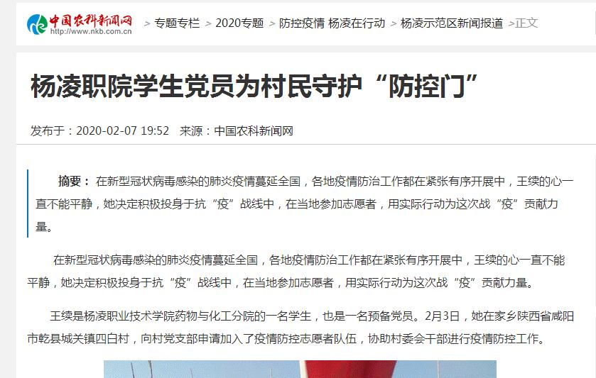 王续是杨凌职业技术学院药物与化工分院的一名学生,也是一名预备党员。2月3日,她在家乡陕西省咸阳市乾县城关镇四白村,向村党支部申请加入了疫情防控志愿者队伍,协助村委会干部进行疫情防控工作。