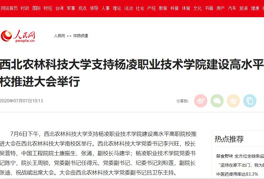 7月6日下午,西北农林科技大学支持杨凌职业技术学院建设高水平高职院校推进大会在西北农林科技大学南校区举行。西北农林科技大学党委书记李兴旺,校长吴普特,中国工程院院士康振生、张涌,副校长马建华;杨凌职业技术学院党委书记陈宁,院长王周锁,党委副书记任得元,党委副书记、纪委书记刘粉莲,副院长张迪、祝战斌出席大会。大会由西北农林科技大学党委副书记吕卫东主持。