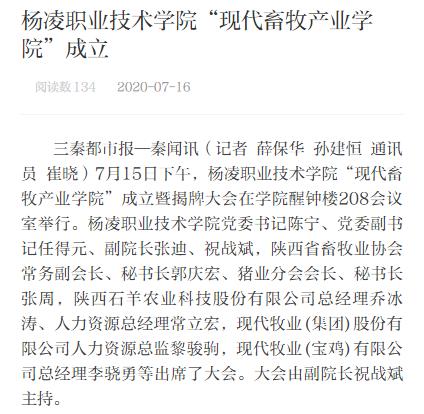 三秦都市报—秦闻讯(记者 薛保华 孙建恒 通讯员 崔晓)7月15日下午,杨凌职业技术学院“现代畜牧产业学院”成立暨揭牌大会在学院醒钟楼208会议室举行。杨凌职业技术学院党委书记陈宁、党委副书记任得元、副院长张迪、祝战斌,陕西省畜牧业协会常务副会长、秘书长郭庆宏、猪业分会会长、秘书长张周,陕西石羊农业科技股份有限公司总经理乔冰涛、人力资源总经理常立宏,现代牧业(集团)股份有限公司人力资源总监黎骏驹,现代牧业(宝鸡)有限公司总经理李骁勇等出席了大会。大会由副院长祝战斌主持。