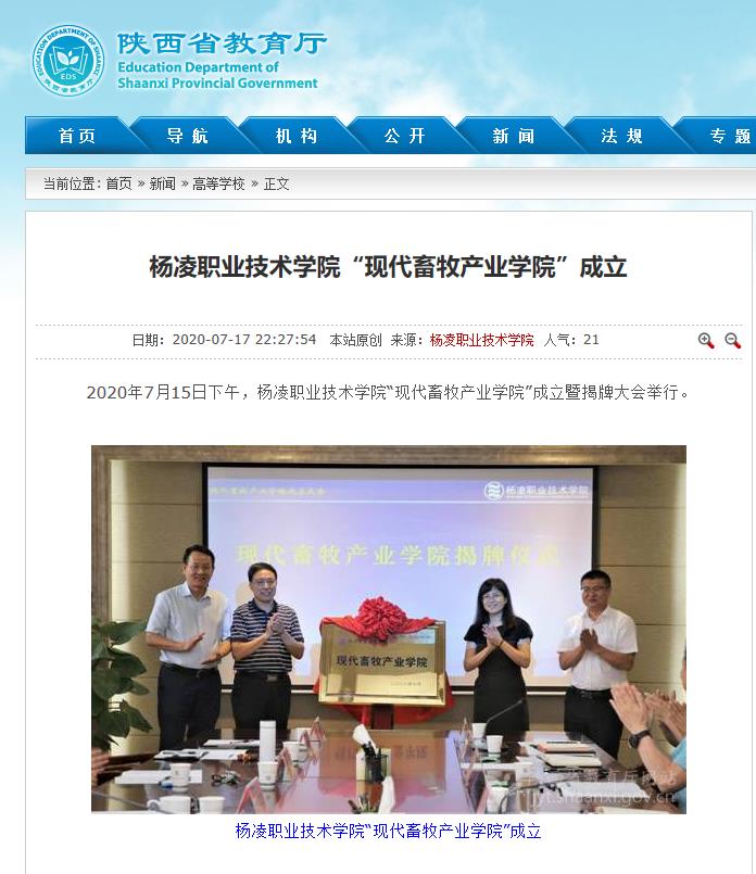 2020年7月15日下午,杨凌职业技术学院“现代畜牧产业学院”成立暨揭牌大会举行。
