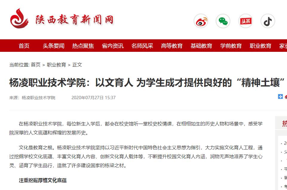文化是教育之根。杨凌职业技术学院坚持以习近平新时代中国特色社会主义思想为指引,大力实施文化育人工程,通过挖掘学校文化底蕴、丰富文化育人内容、创新文化育人载体等,不断提升校园文化育人内涵,润物无声地滋养了学生心灵、涵育了学生品行,造就了许多建设国家的栋梁之材。
