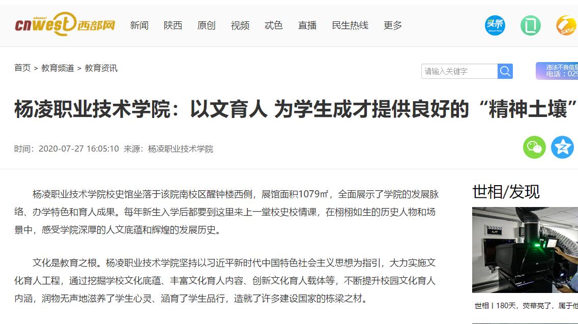 文化育人是大学价值体系的核心和灵魂。杨凌职业技术学院院长王周锁表示,“学院将紧紧围绕立德树人根本任务,以精神文化建设为核心,以形象文化建设为载体,以行为文化建设为抓手,以制度文化建设为保障,不断优化校园文化环境、丰富校园文化生活,构建全方位文化育人格局。”