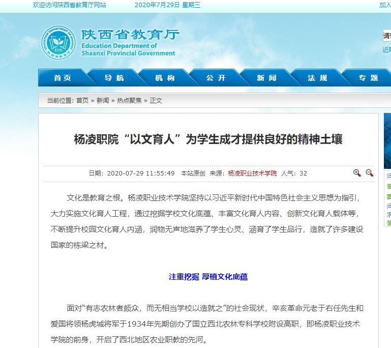 文化是教育之根。杨凌职业技术学院坚持以习近平新时代中国特色社会主义思想为指引,大力实施文化育人工程,通过挖掘学校文化底蕴、丰富文化育人内容、创新文化育人载体等,不断提升校园文化育人内涵,润物无声地滋养了学生心灵、涵育了学生品行,造就了许多建设国家的栋梁之材。