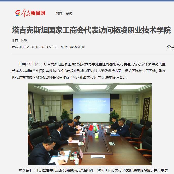10月23日下午,塔吉克斯坦国家工商会驻陕西办事处主任阿达扎诺夫·费道夫斯·法尔哈多维奇先生受塔吉克斯坦共和国驻华使馆的委托专程来到杨凌职业技术学院进行访问,杨凌职院校长王周锁、副校长张迪在南校区醒钟楼204会议室接待了阿达扎诺夫·费道夫斯·法尔哈多维奇。