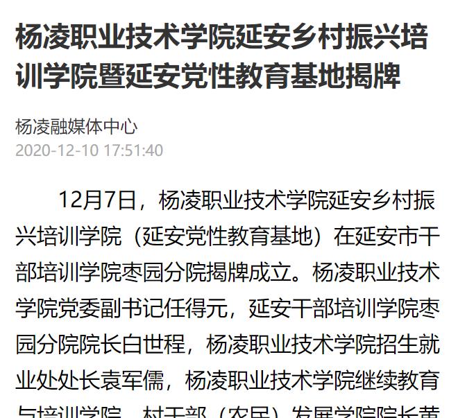 在谈到成立延安乡村振兴培训学院和延安党性教育基地的意义时,杨凌职业技术学院继续教育与培训学院负责人说,延安在党性教育方面具有天然禀赋,具有较强的品牌效应和鲜明的教育主题,在延安成立学院和基地,旨在进一步加强三农基层党员干部党性教育,切实增强基层党组织活动的针对性、生动性和实效性,创新育训形式,拓展育训平台,用活育训资源,丰富思想政治工作的方法和途径。延安乡村振兴培训学院,将在汲取红色文化,发挥职教优势,传承延安精神,进一步履行职业院校育训结合的法定职责等方面做贡献。学院将切实以党建引领乡村振兴,把论文写在三秦大地上,并通过延安这块红色的土地把杨凌农科教优势资源传播到西北乃至全国,为全面建设社会主义现代化国家贡献力量。