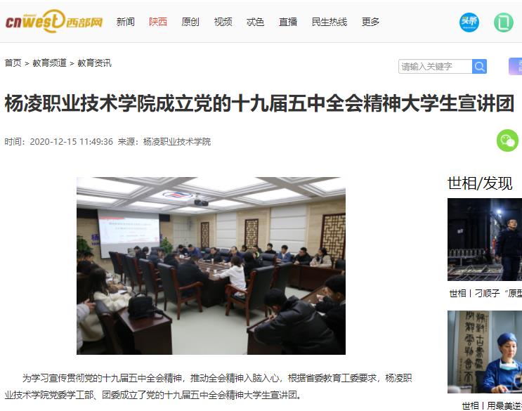 为学习宣传贯彻党的十九届五中全会精神,推动全会精神入脑入心,根据省委教育工委要求,杨凌职业技术学院党委学工部、团委成立了党的十九届五中全会精神大学生宣讲团。
