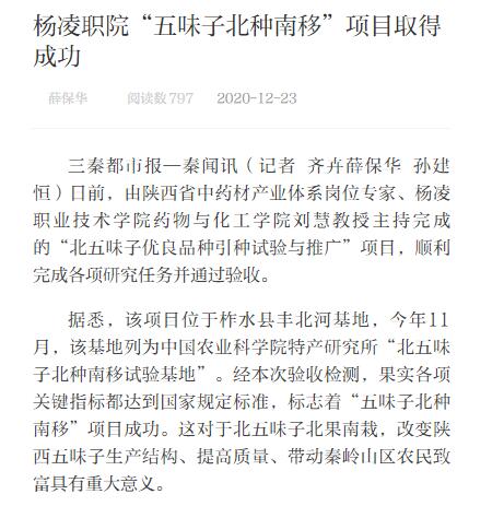三秦都市报—秦闻讯(记者 齐卉薛保华 孙建恒)日前,由陕西省中药材产业体系岗位专家、杨凌职业技术学院药物与化工学院刘慧教授主持完成的“北五味子优良品种引种试验与推广”项目,顺利完成各项研究任务并通过验收。