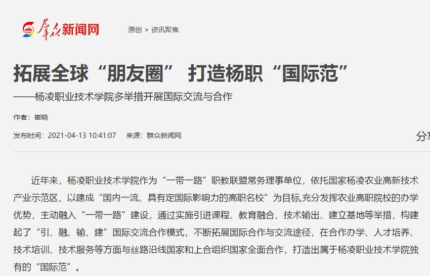 【群众新闻网】拓展全球“朋友圈” 打造杨职“国际范”——杨凌职业技术学院多举措开展国际交流与合作