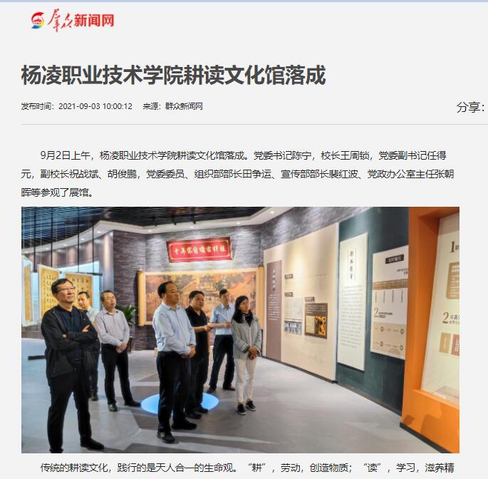 传统的耕读文化,践行的是天人合一的生命观。“耕”,劳动,创造物质;“读”,学习,滋养精神。古代知识分子以“耕读传家”、耕读结合为价值取向,形成了一种“耕读文化”。新时代,耕读文化有新的内涵,自力更生、吃苦耐劳、知行合一、服务奉献等。杨凌职院作为一所涉农高职院校,致力打造师生耕读教育阵地,积极构建“力耕勤读”的校园文化体系。耕读文化馆的落成,旨在教育引导学生在读中行、在行中悟,成为一个知行合一、品格高尚、报效祖国的有用之才。