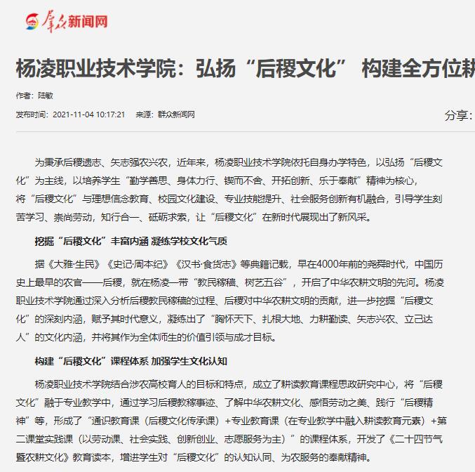 为秉承后稷遗志、矢志强农兴农,近年来,杨凌职业技术学院依托自身办学特色,以弘扬“后稷文化”为主线,以培养学生“勤学善思、身体力行、锲而不舍、开拓创新、乐于奉献”精神为核心,将“后稷文化”与理想信念教育、校园文化建设、专业技能提升、社会服务创新有机融合,引导学生刻苦学习、崇尚劳动,知行合一、砥砺求索,让“后稷文化”在新时代展现出了新风采。